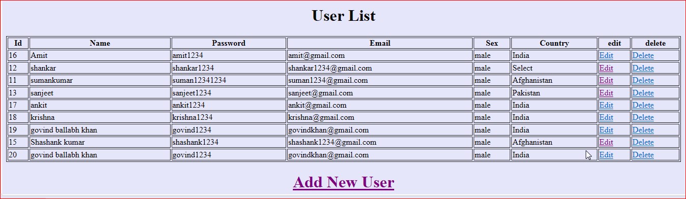<tr><th>Id</th><th>Name</th><th>Password</th><th>Email</th><th>Sex</th><th>Country</th>